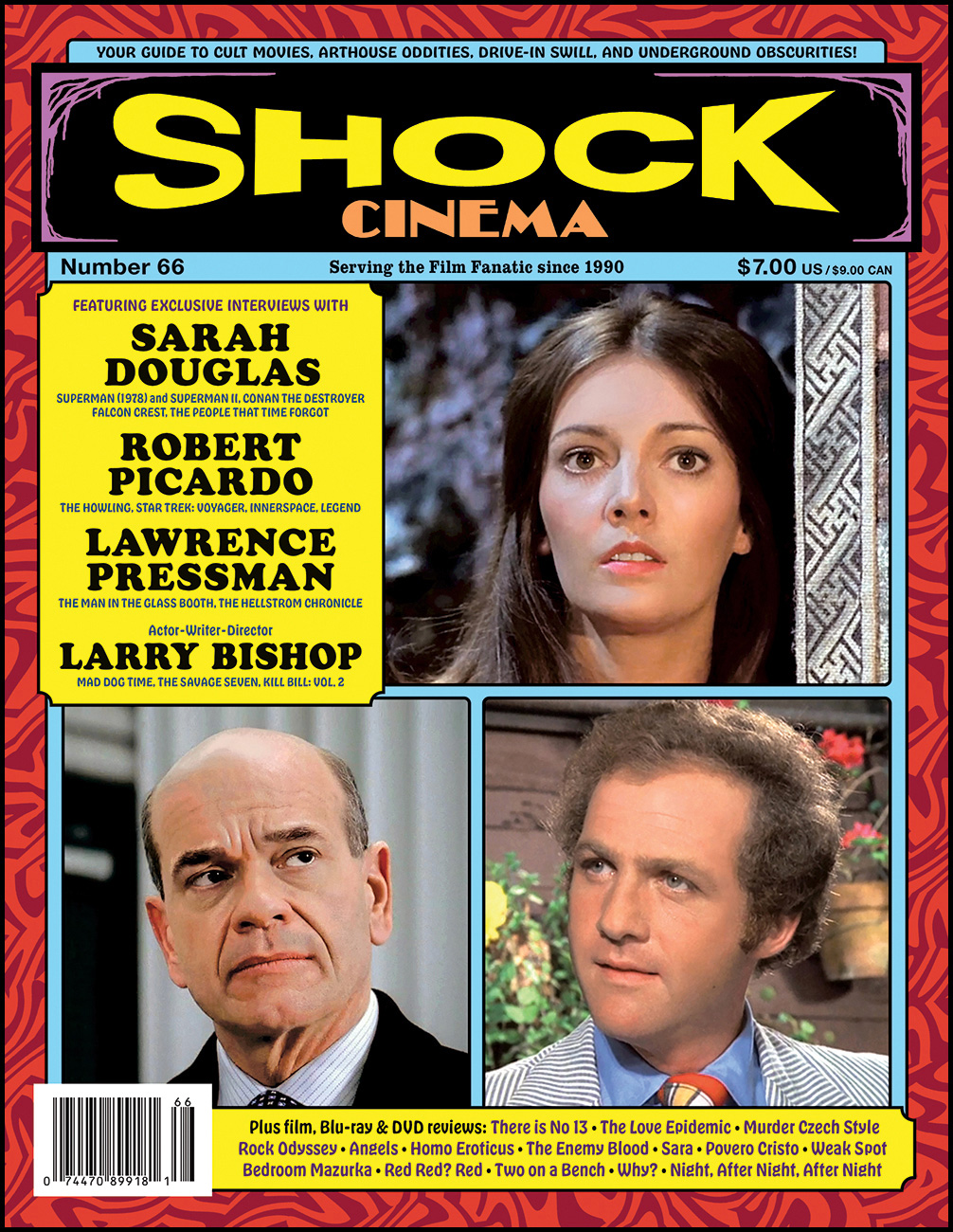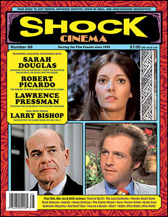 Shock Cinema Magazine is an essential periodical for fans of cutting-edge, retro cinema. Each issue features in-depth interviews with the most intriguing character actors, cult celebrities and maverick moviemakers of all time and critiques a wide array of film obscurities, including grindhouse action, sexploitation, horror, sci-fi, drive-in dreck, overseas oddities, and arthouse dementia. The newest issue of SHOCK CINEMA Magazine (#66) is available at bookstores across the U.S. and Canada. Or you can order directly from the publisher: