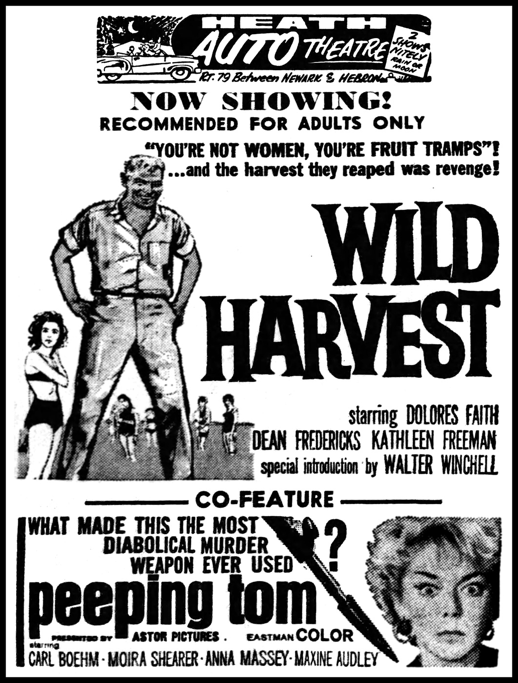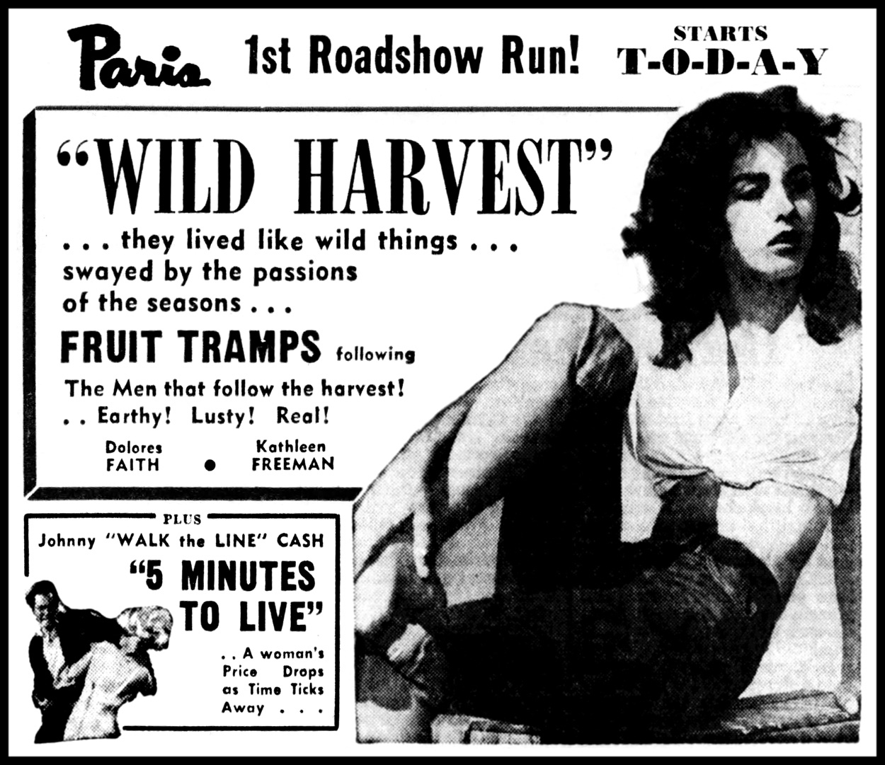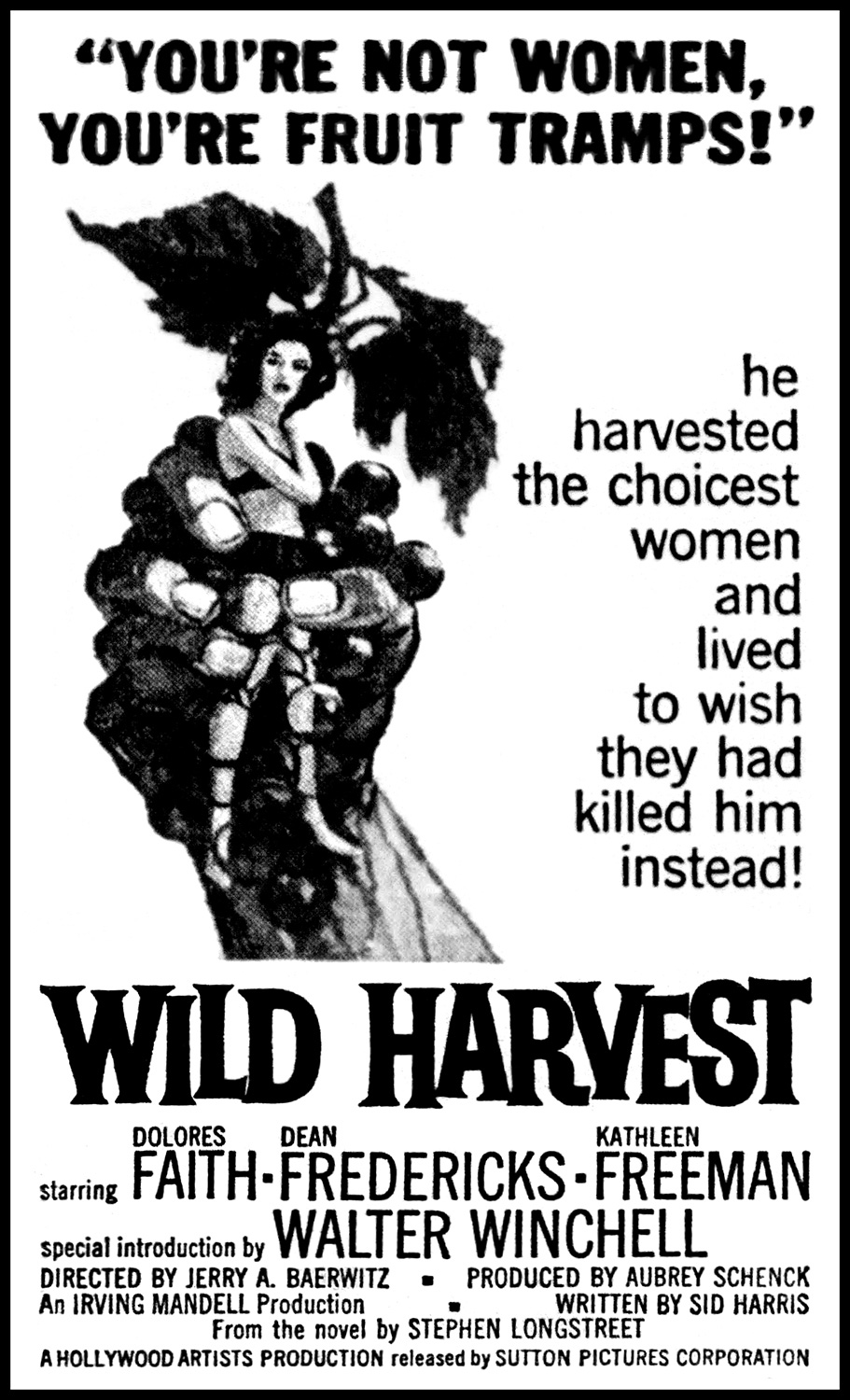 Based on a novel by Stephen Longstreet and directed by Jerry A. Baerwitz (his first and only feature, if you don't count helming English-language sequences for the US version of Toho's VARAN THE UNBELIEVABLE), this enjoyably pulpy, low-budget, black-and-white feature revolves around migrant harvest workers who are considered "animals," "dirt" and "scum of the earth" by local residents, despite doing the crappy, back-breaking, low-paid jobs that no one else wants. Focusing on poor, white, female "third-class citizen" nomads in California, the script keeps any social injustice on the back-burner in favor of tawdry thrills and leaden melodrama, complete with bookending narration by grating syndicated newsman Walter Winchell, whose once-influential career had taken a massive nosedive by this time... Opening with stark, documentary-style footage of workers trudging on foot from job to job, this story focuses on four diverse women arriving at Ludlow Vineyard to pick grapes. Dolores Faith stars as brunette beauty Rose, who'll offer up her body to get whatever she wants from men, even making out with a passing truck driver in exchange for a lift. Others include Kathleen Freeman as wisecracking field veteran Goldie, Susan Kelly (Playboy's May 1961 Playmate of the Month) is voluptuous blonde Madge, and Arlynn Greer plays orphaned Julie, an innocent newcomer to this arduous occupation. The women are kept in line by brutish foreman Whitey (Dean Fredericks), who thinks taking sexual liberties with these "fruit tramps" -- whether it's slutty Rose or unwilling Madge -- is one of his job perks. Meanwhile, vineyard owner Sam Ludlow wants to turn his bleeding-heart, college-educated son Tom (Robert Harrow), who genuinely worries about the workers and their shabby living conditions ("Those women aren't pigs, they're human beings!"), into a real man by secretly pitting him against macho meathead Whitey. Along the way, Rose gets pissed when Julie snags a cushy housekeeper "inside job," which doesn't involve field work; Whitey secretly plans to someday run this ranch; there are drunken outbursts; plus "agitator" workers led by fed-up Goldie finally take action -- culminating in a wonderfully cheesy, revenge-fueled finale during which these exploited women band together in order to (though it's never stated outright or shown on-screen) castrate Whitey with their pruning shears... None of this is remotely subtle, but it is amusingly risqué trash (by 1961 standards) peppered with gratuitous showers and catfights. The film is also bolstered by a handful of committed performances, particularly 21-year-old Faith (who'd previously starred in 1961's DAMAGED GOODS) as promiscuous Rose. Initially promoted as a younger, Elizabeth Taylor-style sexpot, Faith was certainly lovely but her showbiz career went nowhere, and after appearances in sci-fi schlock like MUTINY IN OUTER SPACE and THE HUMAN DUPLICATORS, she married Maxwell House millionaire James Robert Neal in 1972, quit acting and passed away in 1990 at the age of 48. Fredericks, who'd played comic-strip pilot Steve Canyon on a short-lived '50s TV-series and worked with Faith a year earlier on THE PHANTOM PLANET, makes a suitably repulsive heavy. Plus longtime character actress Freeman -- a comedic scene-stealer in everything from Jerry Lewis' THE LADIES MAN to THE BLUES BROTHERS -- has a rare opportunity to show off her capable dramatic chops.