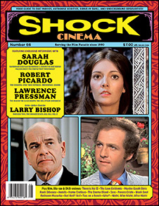 SHOCK CINEMA 52. Interviews with Jon Gries, Warren Berlinger, Larry B. Scott, William Morgan Sheppard, and Art LaFleur. Reviews include Bruce Davison in John Flynn's The Jerusalem File; Bernie Travis in Dirtymouth; Julie London in Hugo Haas' Night Of the Quarter Moon; James Brolin and Cliff Gorman in John Korty's Class of '63; Nicol Williamson and Anna Karina in Tony Richardson's Laughter un the Dark; Chris Robinson and Mickey Rooney in Ace Of Hearts [Juego Sucio en Panamá]; Hannelore Elsner in Will Tremper's The Endless Night [Die Endlose Nacht] ; Stacy Keach and Roger Moore in Street People; Marie-France Pisier, Bulle Ogier and Leslie Caron in Sérail [Surreal Estate]; Andrew Leavold's The Search For Weng Weng; Eckhart Schmidt's Loft; Harry Guardino in The Lonely Profession; Joseph Bologna and Barbara Harris in Mixed Company; Jean Seberg and James Mason in Kill; Miklós Jancsó's Private Vices, Public Virtues; Khigh Dhiegh, Mako and James Hong in Judge Dee and the Monastery Murders; James Bickert's Frankenstein Created Bikers; Lucinda Dooling in Lovely But Deadly; Marcello Mastroianni and Marthe Keller in Down the Ancient Stairs; Michel Piccoli in The Prize of Peril; Gérard Kikoïne's Mannequin; Joe Don Baker in Phil Karlson's Framed; Riccardo Freda and Mario Bava's Caltiki, the Immortal Monster; et cetera.
