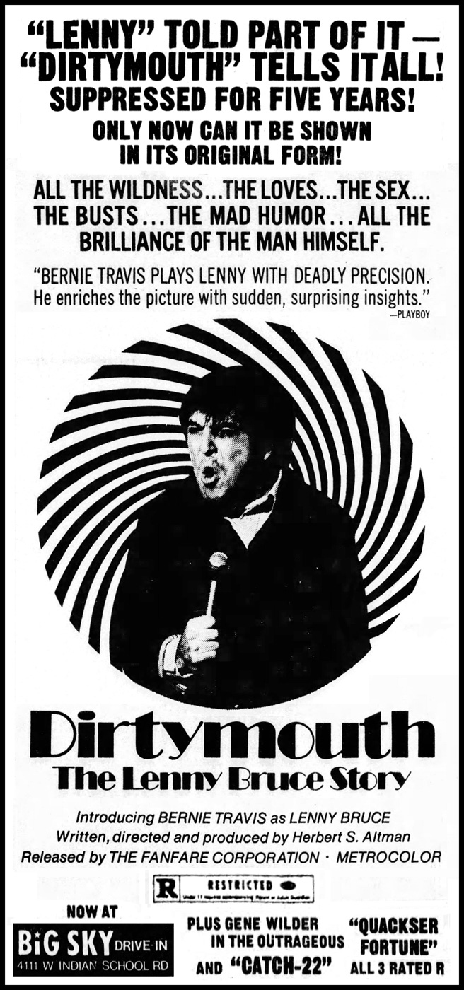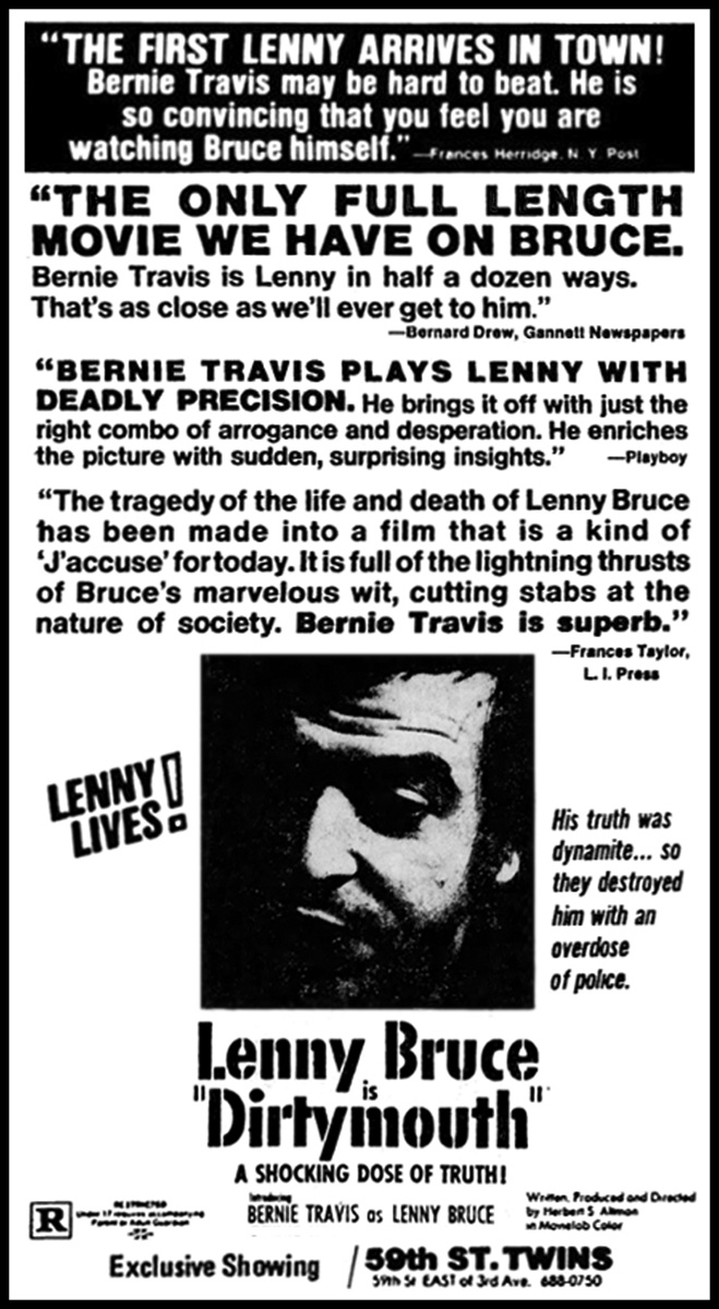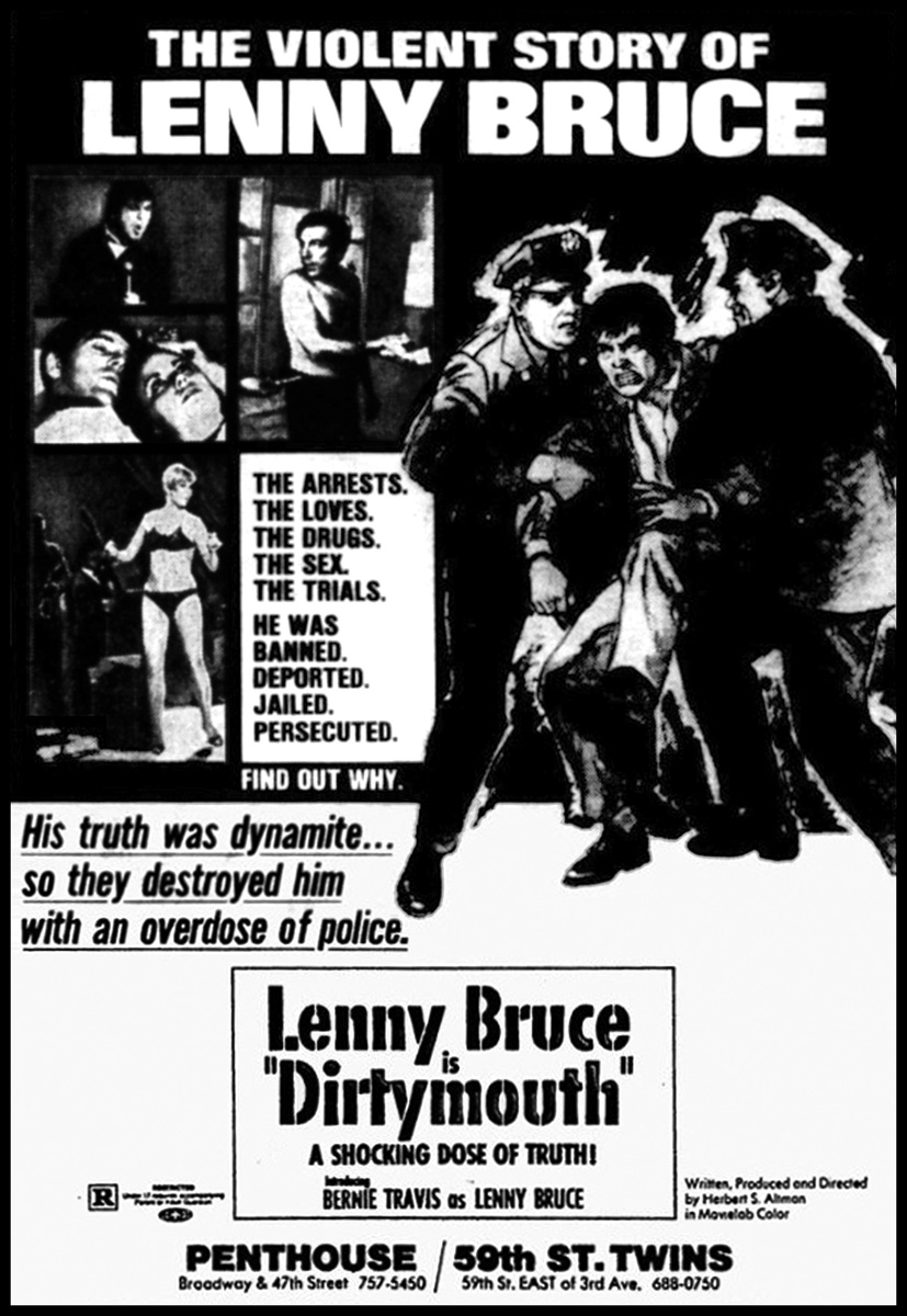 Found on the bathroom floor of his Hollywood Hills home, Lenny Bruce died in 1966 at the age of 40, but the legend of this controversial, persecuted stand-up continued to grow over the next several years, thanks to a Tony-winning 1971 Broadway show, Bob Fosse's Oscar-nominated 1974 bio-pic and Albert Goldman's best-selling biography. There was also the low-budget, barely-remembered DIRTYMOUTH -- lensed in 1969, released two years later in hopes of piggybacking onto the play's success, then reissued in 1975 while LENNY was in theatres. In this instance, at least writer-director Herbert S. Altman actually knew his subject, since he'd once hired Bruce to star in an aborted 1965 sci-fi comedy entitled GIRLS FROM EROTICA, with New York City nightclub comedian Bernie Travis (also credited as a script consultant) gamely stepping into the lead role. Pathetically cheap looking, badly acted, crudely slapped together, but often exceptionally weird -- from opening credits written on cards as they're being flushed down a toilet, to a ridiculously poppy title song ("Hey, Mr. Dirtymouth") warbled by The Free Design and repeated throughout the film -- this might be an amateurish, incompetent mess, but there's no shortage of good intentions on display. Far from make-a-quick-buck exploitation, it's actually much tamer than Fosse's version... Opening in the 1950s, with frustrated Lenny Bruce complaining to his agent that he's tired of playing shithole clubs in the sticks and instead yearns to be a "hip Will Rogers," he wanders pensively about the city and soon finds himself torn between two very different women in his life. On one hand, there's statuesque burlesque dancer Marlene Sinclair (Miss Sam Teardrop), a surrogate for Honey Harlow, Lenny's future wife; on the other, off-key folk singer Iris McCabe (Courtney Sherman [m: Simon], future soap opera writer for SANTA BARBARA and ONE LIFE TO LIVE) is a loose version of jazz singer Annie Ross. And while shy Iris has "hang-ups" about dating such a bitter guy, she finally goes to bed with him after Lenny shocks her uptight mom with his act. But just as mainstream showbiz success is within his grasp, Bruce refuses to kowtow to network censors and pisses off powerful, flag-waving, conservative assholes with his "vulgar" rants about organized religion and government. The film loses much of its steam in the second half though, as Lenny antagonizes "the wrong people" and remains stubbornly self-destructive 'til the very end, with the clunky script weighed down by long-winded, disjointed discussions and cartoonish courtroom proceedings. By the midpoint, he's being hauled out of his hotel room by the cops, district attorneys conspire to bust him for daring to make fun of the Pope and America, with the entire thing falling apart in its final minutes... Almost completely ignoring Lenny's drug use, marriage and family, while haphazardly cramming together actual events (e.g., Lenny is found guilty of obscenity in a NYC courtroom, goes straight home and promptly dies on his bathroom floor -- even though the two events occurred 20 months apart!), the film never comes close to capturing Lenny's scathing brilliance or distinctive voice. Of course, that's difficult to pull off when you don't own the rights to any of Bruce's actual performance material (with a couple of the film's monologues forcibly cut due to injunctions following an early trade screening). In his only screen role, Travis manages to bring out Lenny's softer side early on, as he charmingly schmoozes clientele, covers up for junkie colleagues and vents his career frustrations, but is incapable of replicating Bruce's on-stage mannerisms or edgy charisma. Say what you will about Dustin Hoffman's take on the role, but Travis comes off more like a 3rd-rate Grossinger's lounge act or, even worse, the obnoxious ranting of some disheveled homeless guy. Nevertheless, he was later cast in a 1971 Off-Broadway play about Bruce, only to have it slapped with a restraining order by the Broadway show's producers just before opening night.