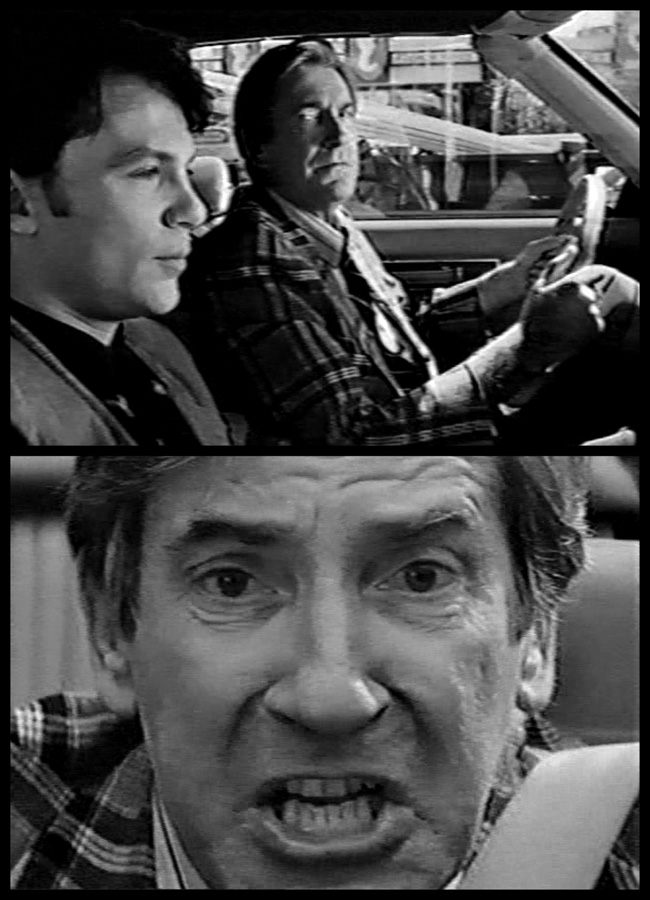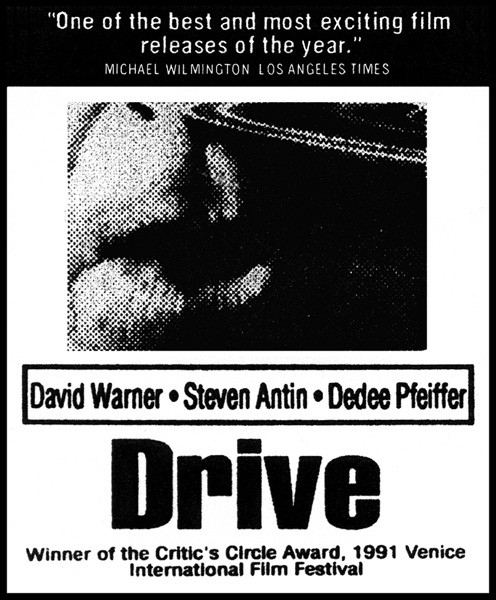 With so many crappy 'indie' films readily available on video, you can't help but wonder what ever happened to this hilarious little gem, which had a brief theatrical run in Los Angeles and essentially vanished. Shot in black-and-white and directed by first-timer Jefery Levy, this is a blissfully eccentric road movie that's blessed with a transcendent performance by David Warner -- who creates the most deliriously motor-mouthed character to slide behind the wheel of a car since Warren Oates in TWO LANE BLACKTOP... The plot is deceptively simple and uninviting, as we spend 86 minutes watching Warner (simply known as "the Driver") on a lengthy commute to work in his Chrysler convertible, spewing his boundless knowledge and opinions to his usual Passenger (Steve Antin, of THE LAST AMERICAN VIRGIN infamy) as they deal with California traffic. Being trapped inside a car for nearly the entire film might sound dull, but cinematographer Steven Wacks' inventive visuals and Warner's non-stop, twisted monologues make it an exhausting experience -- spouting his skewed opinions on everything from the homo-eroticism of football, pornography, AIDS, society in all of its forms, and Antin's "loser" life (in between swigs from his gigantic coffee cup). Meanwhile, his Passenger is suffering from a broken relationship (with Dedee Pfeiffer, Michelle's younger sis, who's glimpsed in fragmented memories), plus increasing annoyance at Warner's endless speeches. Hell, this guy can even talk about the act of talking! Eventually spinning into even loonier directions, the two discuss making a movie based on their drives, along with reverse photography, flubbed lines, and making faces into the camera. So, is there a point to it all? Not really, but it's a electrifying trip down the road to nowhere... Warner has often stolen the show in supporting roles, and here he's given topbilling and full reign to go nuts (thanks in large part to screenwriter Colin MacLeod's riotous rants). Thank goodness, because Antin's character is a bland, spineless twenty-nothing, who continually bitches but does little to change his situation. Despite the script's constricting conceit, Levy keeps it as playful as possible, with quick cuts, glides across the car's chassis, flashbacks, strange segues, and local scenery. It's also obvious that Levy shot his creative wad on this heavily-styled tale, because his later flicks (INSIDE MONKEY ZETTERLAND, S.F.W.) were annoying flops that could've been made by an entirely different person.