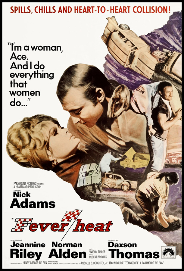 Before co-founding Mark IV Pictures in 1972 and subsequently writing-producing the four-film 'end times' series that began with A THIEF IN THE NIGHT, Russell S. Doughton, Jr. directed this Iowa-lensed dirt track racing melodrama. Hard to believe, it's often as punishingly leaden as his overtly-Christian outings, but the film is rescued from abject lousiness by an efficient script courtesy of Henry Gregor Felsen (author of a string of popular teen-pulp hot rod novels using the pseudonym Angus Vicker, and based on his own 1954 book). But be forewarned: although its ad campaign makes this look gritty and hard-hitting, it's actually squeaky-clean, G-rated fare... Nick Adams stars as "Ace" Jones, a hotheaded stock car expert who's new in town, stops at a rundown garage to fix his truck, and gets an eyeful of owner Sandy (Jeannine Riley, PETTICOAT JUNCTION's original Billie Jo), a buxom blonde widow whose husband died in a racing wreck. Within minutes, fast-talkin' Ace convinces Sandy to make him a partner in her business, he begins chasing down all of her deadbeat customers for overdue bills and even convinces Sandy's young brother-in-law to race at the local track in dead hubbie's rebuilt jalopy. Soon cocky Ace is feuding with sleazy speedway owner Herb Herpgruve (Norman Alden, scientist/mentor Frank Heflin on the original ELECTRA WOMAN AND DYNA GIRL), asking Sandy to marry him after only a couple days [Note: though lensed during the proverbial Summer of Love, nobody gets past first base in a Doughton film until they're legally wed], and spouting inane platitudes about the manliness of racing. Let's not forget about Vaughn Taylor (PSYCHO), playing against type as quirky, poten-tially unstable old mechanic Toad Taplinger, with Al Ruscio popping up briefly as a competing driver... Sporting a beat-to-hell US Army Campaign hat and plenty of attitude, Adams (who passed away three months before the film's release from a prescription drug overdose at the age of 36) looks puffy and grizzled, but the once Oscar-nominated actor (for 1963's TWILIGHT OF HONOR) is the only thing keeping us awake throughout this giant turd. And while Riley might be pretty, her character is shrill, stupid and obviously spent all of her garage's past income on mascara. But Doughton is the most egregious offender here, displaying zero directorial finesse or simple subtlety -- from the idiotic secrets lurking in the leads' pasts, to all of the ham-handed temptations (greed, lust, pride) littered throughout it script. Will Sandy choose true love or monetary security? Will Ace sacrifice the freedom of the road for the allure of family? Doughton has no sense of pacing, his characters are ludicrously inconsistent, and while it incorporates lots of authentic, small-town speedway footage, he's incapable of making a fiery racetrack finale even mildly exciting. No surprise, Doughton soon shifted to explicitly Christian projects, since it assured him a blindly supportive audience that wouldn't question his obvious ineptitude behind the camera. Complete with a title tune sung by future HEE-HAW castmembers The Hager Twins.