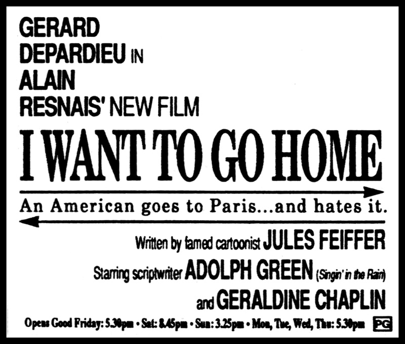 Without question, Alain Resnais is one of cinema's most insightful auteurs, with wide-ranging masterpieces such as HIROSHIMA, MON AMOUR, LAST YEAR AT MARIENBAD and LA GUERRE EST FINIE under his directorial belt. Well, this barely-released feature was an altogether different endeavor for the guy. Written by cartoonist Jules Feiffer and peppered with perplexing cast decisions, this is a four-star fiasco! A head-scratching debacle that proves anyone is capable of royally screwing up... Laura Benson is at the center of this nonsense as Elsie, the daughter of an acclaimed cartoonist, who lives in France in order to avoid her dad. Veteran scriptwriter-composer Adolph Green (SINGIN' IN THE RAIN, ON THE TOWN) plays that ever-grumpy papa, Joey Wellman, who reluctantly accepts an invitation to a Paris comic convention, as an excuse to visit long-estranged Elsie. Of course, the moment the two meet, all of their old tensions re-erupt. Increasing the story's annoyance factor, both Joey (who hates France) and Elsie (who resents Dad) have imaginary animated confidants -- Joey's is his famous feline creation Hepp Catt, while Elsie's is childhood pal Sally Catt -- and each pops up in crude cartoon-balloons whenever they face some trivial crisis. Trust me, it's fucking painful. A post-ALICE Linda Lavin turns up as Joey's girlfriend Lena, who's barely able to tolerate his grating personality, while Gerard Depardieu plays Elsie's womanizing professor (who she has an inexplicable crush on). But Gerard is also a hardcore fan of Wellman's work, and eventually invites the old coot to a weekend at his mother's country estate, along with Geraldine Chaplin and John Ashton (BEVERLY HILLS COP) -- with Elsie showing up as an uninvited guest. Its barely-there story culminates in an elaborate comic-character masquerade (with Lavin dressed up as Olive Oyl and Depardieu as Popeye), secret seductions, painful encounters, and even a huge knockdown brawl. Meanwhile, emotionally-estranged dad and daughter reconnect in the most inane and upbeat possible way... Green might be talented in real life, but you'll want to kick his withered, impossibly-cantankerous character down a flight of steep stairs, as this Grumpy Old Tourist bitches about his inability to understand the language, his daughter, his fans, life itself, and his desire to go back home. Sure, the scenario is unpredictable, but it's also totally uninvolving and stupid. Topped off with an unmemorable soundtrack by CABARET-composer John Kander, the film is visually drab, the actors seem (justifiably) confused, and its fantasy elements are intolerable. Honestly, it's impossible to believe that Resnais was actually at the helm. I'd prefer to think that he jumped ship just before production started and was anonymously replaced with Joel Schumacher. Somebody, dig a deep hole and give this stinkbomb a proper burial!