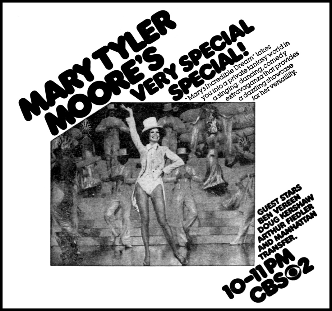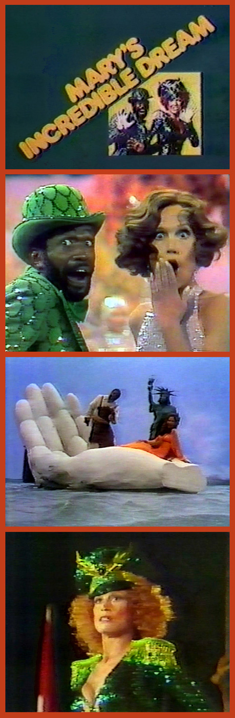 In the 1960's, Mary Tyler Moore epitomized the young American housewife in THE DICK VAN DYKE SHOW; in the early-seventies, she became the modern working woman in THE MARY TYLER MOORE SHOW; but by 1976, her out-of-control ego flushed away much of that accumulated goodwill with this hilariously deluded, hour-long musical-fantasy-abomination for CBS-TV (premiering on January 22, 1976). Cramming a wide range of hit tunes into a pretentious dream-scenario smorgasbord that spans humankind's history (and beyond), our disconcertingly-scrawny, frizzy-permed diva proudly shows off her extremely-limited singing and dancing skills. But before this gaudy, indulgent MTM Enterprises "spectacular" is over, you'll have the urge to beat Mary Tyler Moore senseless with a sockful of nickels. When we first see Moore, she's sound asleep (in the type of flowing pink nightgown usually reserved for Doris Day movies) and floats away on a musical odyssey that begins at the Pearly Gates, with The Boston Pops' Arthur Fiedler leading a celestial choir, that detestable vocal quartet The Manhattan Transfer (who repeatedly interrupt any halfway-decent scene) inside a giant radio, plus a bearded, green-sequin-tuxedoed, '666'-monogrammed Ben Vereen as Lucifer. From there on, it just gets goofier, with Mary and her guests playing multiple roles. Is there an Adam and Eve sequence? You betcha! How about cavewoman Mary weakly warbling Cy Coleman's "Nobody Does It Like Me" into a dinosaur-bone microphone? A Renaissance sequence featuring "Alfie," "Runnin' Wild" and the obtrusive Manhattan Transfer singing The Ink Spots' hit "I Love Coffee, I Love Tea"? A shit-kicking musical number with portable washboards? Vereen and Mary as Mr. and Mrs. Noah, post-flood, floating about on a giant plaster hand (with the Statue of Liberty and the Eiffel Tower submerged in the background)? Oh, and let's not forget to include an excruciatingly boring ballet sequence. Things almost perk up when Vereen grabs a solo for Cole Porter's "Let's Misbehave" and fiddle-playin' Cajun Doug Kershaw maniacally blasts through Johnny Horton's "The Ballad of New Orleans", but those moments are all too brief. A few contemporary tunes are also covered, including The Rolling Stones' "Sympathy for the Devil" (sung by The Devil, of course) and Moore absolutely murdering Cat Stevens' sublime "Morning Has Broken". If you haven't already figured it out for yourself, this was one seriously brain-fried hour of primetime TV. Created and written by Jack Good (no stranger to bizarre musical projects, after producing 33-1/3 REVOLUTIONS PER MONKEE and Patrick McGoohan's modern-day, Othello-musical CATCH MY SOUL) and directed by Gene McAvoy and Jaime Rogers (both on a break from their jobs on THE SONNY & CHER SHOW as, respectively, art director and choreographer), this obviously-coked-out idea might've been a whole lot trippier if its production budget didn't look cheaper than an episode of PINK LADY AND JEFF. Plus every time you think it couldn't possibly get any worse, it does! This is the type of full-blown fiasco where Ben Vereen, writhing about in a one-piece, red jumpsuit that's cut down to his navel is an aesthetic highpoint. Hard to believe, this wrongheaded debacle was nominated for three Emmy Awards (all in technical categories).