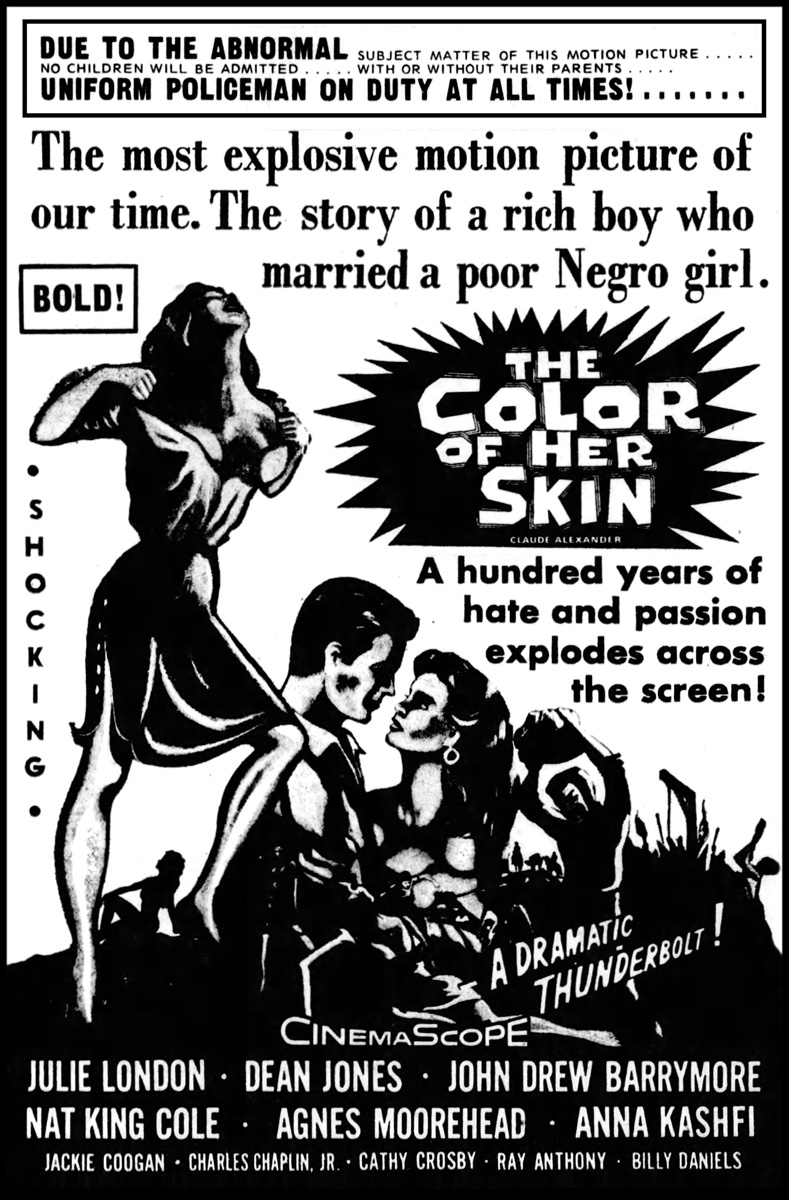 Hugo Haas left Czechoslovakia for Hollywood in the early-1940s, after the Nazis rolled through his homeland, directing (and often starring in) such delirious B-movies as HIT AND RUN, PICKUP and LIZZIE. One of his later efforts was this wonderfully tawdry, miscegenation-themed, b&w MGM melodrama produced by Albert Zugsmith, who was always ready to leap onto any vaguely exploitable topic, whether it was HIGH SCHOOL CONFIDENTIAL, THE BEAT GENERATION or SEX KITTENS GO TO COLLEGE. It's a leaden look at love in the face of racism, as well as a classic example of Hollywood whitewashing, with smoky-voiced, blonde torch singer Julie London ("Cry Me a River") darkened up in order to play the lead... Lovely but slightly-off-white newlywed Ginny Nelson (London) hasn't even unpacked her new suburban San Francisco home when young hooligans (Frank Gorshin, Norman "Woo Woo" Grabowski and Charles Chaplin, Jr.) begin chucking rocks through her living room window and ripping up her front yard shrubbery in broad daylight, but when her hotheaded hubbie Chuck (John Drew Barrymore, Drew's equally hotheaded dad) overreacts, he ends up arrested instead. In flashbacks, we then see how this couple met, with shell-shocked Korean War vet Chuck promptly falling for Ginny, the exotic, skinny-dipping daughter of an Irish fishing boat captain, during a business trip to Mexico. Ignoring the fact that Ginny's grandma was from Portuguese Angola in Western Africa -- meaning she's "one-quarter Negro"! -- high society scion Chuck marries her, with the pair returning to San Francisco and facing reality after meeting each other's families. While the couple are embraced by Ginny's cousin Maria (Anna Kashfi, then-current wife of Marlon Brando), who runs a swanky black nightclub with her husband Cy (Nat 'King' Cole, crooning to the crowd and also warbling the film's Sammy Cahn/Jimmy Van Heusen title tune), Chuck's kin includes his domineering, racist-bitch mother (Agnes Moorehead). After Ginny is outed as a "quadroon" by local newspapers, the couple are kicked out of their hotel suite, nervous neighbors don't want a "colored" person on their street, plus Chuck's family considers him a "sick boy" for loving a non-white woman -- keeping him heavily sedated, locked up and bullying him into suing for an annulment... The screenplay by (future Oscar-nominees for Frankenheimer's THE TRAIN) Franklin Coen and Frank Davis eventually descends into pure cornball melodrama during the final half-hour, as the Nelson clan tries to prove that Ginny is a money-grubbing floozy, along with then-racy courtroom theatrics and a sappy conclusion. There's little nuance in the acting department either -- Barrymore plays it wildly over-the-top and London (ex-wife of Jack Webb, looking like she merely has a heavy suntan) lacks any depth -- with the lone exception being James Edwards (HOME OF THE BRAVE) as Ginny's savvy attorney. The eclectic supporting cast includes Arthur Shields (Barry Fitzgerald's younger brother) as Ginny's dad, Jackie Coogan is a desk sergeant, singer Billy Daniels ("That Old Black Magic") plays a headwaiter, plus it's quite amusing to see future Disney fixture Dean Jones as Chuck's shithead brother. The Cinemascope cinematography is courtesy of Ellis W. Carter, who shot '50s Universal genre-classics such as THE INCREDIBLE SHRINKING MAN and THE MOLE PEOPLE. Although the film's subject matter might seem tame nowadays, you need to remember that a 1958 Gallup Poll showed that 94% of white Americans disapproved of interracial marriage, so this was fairly subversive material in its time, with Zugsmith squeezing as much cash as possible from it by re-releasing the film in 1962 under the title FLESH AND FLAME, then again in 1966 as THE COLOR OF HER SKIN.