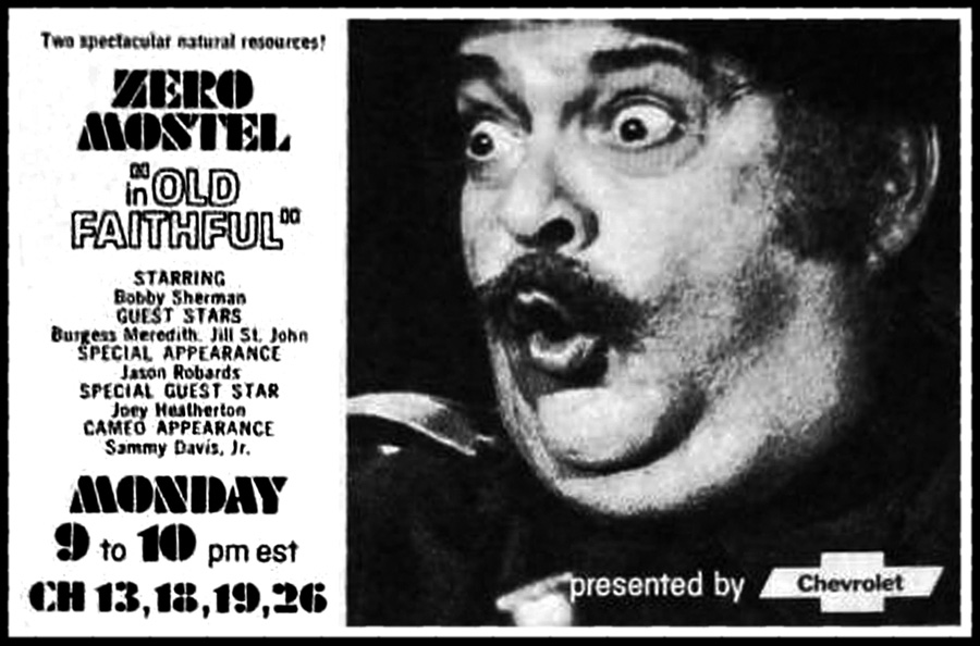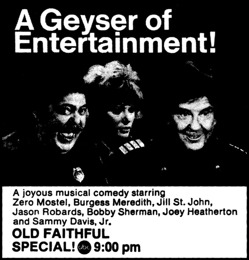 Telecast on ABC-TV, this hour-long special is just your ordinary, upbeat, musical tribute to Yellowstone National Park... as sponsored by the Chevrolet Motor Division. Sounds painful? Absolutely! The program's production values are about as low-rent as you can get for a prime-time project (i.e. much of it takes place on an empty hotel-lobby set), while the biggest musical names they could round up were (perpetual Ann-Margret knock-off) Joey Heatherton and Bobby Sherman (two years past his Tiger Beat expiration date). Zero Mostel stars as Forest Ranger Zeppel, who bursts from a pile of leaves and breaks into song ("I'm old faithful, / To all my furry friends"), while shaking his rotund rump through the woods and serenading obviously-sedated woodland creatures (a raccoon, a deer, a chipmunk on his arm, et cetera). But all is not peaceful in this park, because Zeppel's grumpy boss (Burgess Meredith) orders him to figure out a way to break Yellowstone's attendance record this weekend... or he's fired! So this fat doofus decides to put on a show, and cons a few celebrities into attending by promising to re-name the Old Faithful geyser after each one of them. Brilliant! Flirtatious hotel desk clerk Jill St. John convinces Jason Robards to appear at this event, while Joey and mustached Bobby round out the scam, with both of them [warning: product placement alert!] driving their Chevys to Wyoming (yeah, I really believe that Sherman owns a wood-paneled station wagon!). As for the music, Bobby sings "Together Again," then Robards and St. John share a duet of "Brush Up Your Shakespeare." In the hour's one amusing gag, Joey keeps a pair of flamboyant male back-up dancers stuffed in her car's trunk, then busts out a sexy, black-leotarded song-'n'-dance to "The Road I Took To You (Pieces)." In fact, Heatherton is the only decent thing about this dud -- putting the same manic energy into a shitty throwaway job that she would for a real gig with Perry Como or Andy Williams. When these three stars uncover Zeppel's ruse, it threatens The Big Show for about two minutes, until Bobby takes to the stage in a hideous '70s-jumpsuit for the corny "Goodtime Song" [cut to: visibly-bored crowd shots] and Joey belts out "Someone To Watch Over Me." Twelve years earlier, Mostel and Meredith co-starred together in a TV-staging of WAITING FOR GODOT, which makes the sight of this talented pair singing about being Forest Rangers particularly pathetic. It's a paycheck, I guess. Meanwhile, director Jorn Winther (who later directed the '77 Frost/Nixon interviews!) goes heavy on the canned laughtrack, and Sammy Davis Jr. makes a brief cameo as himself, visiting the park and getting mistaken for Bobby Sherman by Zeppel. Yep, that's the level of the script's humor, courtesy of ex-LAUGH-IN castmates Larry Hovis (HOGAN'S HEROES) and Anne Elder, with forgettable new songs by Al Kasha and Joel Hirschhorn (who both won an Oscar the next year for the sappy POSEIDON ADVENTURE tune "The Morning After").