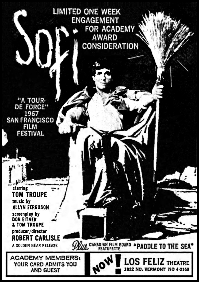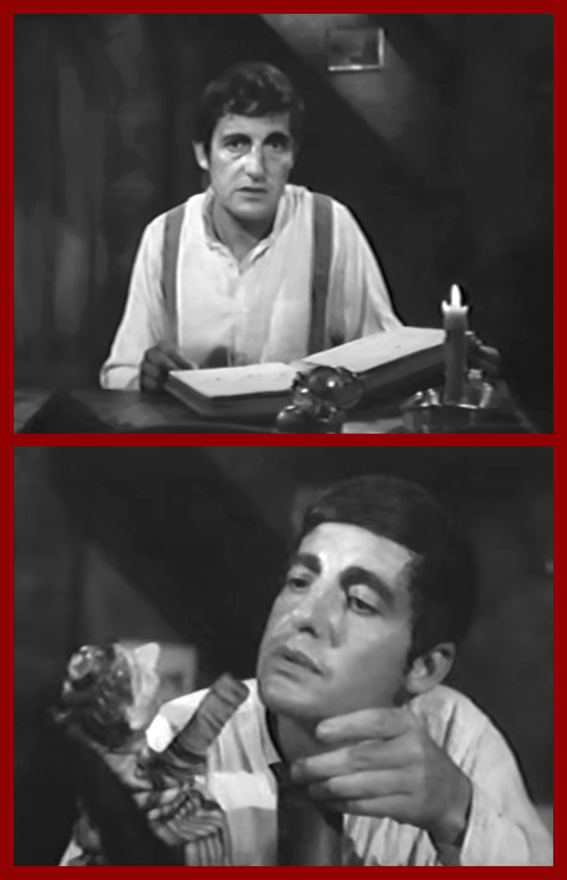 Adapted from Nikolai Gogol's 1835 short story "Diary of a Madman" -- a first-person trek into obsessive-compulsive behavior and insanity -- this low-budget indie feature is outwardly simplistic, increasingly melancholy and defiantly uncommercial, while providing a tour de force role to longtime character actor Tom Troupe (KELLY'S HEROES). Shot in black-and-white, featuring only one actor and mostly taking place in one dreary room, the project began as a 1966 Los Angeles workshop, adapted by Troupe and fellow Melrose Theatre founding member Don Eitner from a 1963 London stage production by Richard Harris and Lindsay Anderson. But this cinematic record barely found a spot on the festival/arthouse circuit. It's consistently intriguing but, at 96 minutes, often a rather difficult slog... A lowly civil servant known only as The Clerk (Troupe) returns to his squalid little apartment after a day's work, jotting ideas into a diary and confessing to the camera. But while his initial thoughts are fairly commonplace complaints about his job, bosses and co-workers, the man begins to hear voices and gradually becomes lost in troubling fantasies, such as how a dog suddenly spoke to him in English. As the weeks and months roll by, he also repeatedly talks about a lovely young woman named Sofi, his boss' daughter, as well as the embarrassment he feels about his own poverty and growing annoyance at everyone around him. But as The Clerk's obsession with Sofi grows, he also becomes increasingly unhinged. The results are hit-and-miss to say the least, with long bouts of monotony (e.g., reading letters supposedly written between two dogs) balanced out by some wonderfully bizarre bits (The Clerk's sole companion is a tiny hand puppet, which he calls an "impotent little bedpost sitter" and ends up stuffing into his stove in a moment of anger). Eventually convinced that he's actually the fugitive King Ferdinand of Spain, with an old broom as his scepter -- which will surely win him Sofi's love! -- his diary entries become unintelligible, his home gets messier, his appearance more unkempt, and his delusions darker and more disjointed. Only in the final 15 minutes does the setting shift, with our broken Clerk still pining for his one great, imaginary love... Between the script's restrictive framework and the production's obviously threadbare budget, director Robert G. Carlisle (a music/sound effects editor on films like MARTY and SWEET SMELL OF SUCCESS, in his sole directorial feature) was fairly limited in terms of style or experimentation, and with the exception of a brief outdoor sequence under the opening credits, it's a totally stagebound work, with cinematographer Alfred Taylor (SPIDER BABY, KILLER KLOWNS FROM OUTER SPACE) doing his damnedest to energize the proceedings. It's primarily Troupe's baby though. First tackling this demanding role at 38 years old -- even as he was racking up guest spots on MISSION: IMPOSSIBLE, STAR TREK and THE WILD WILD WEST -- Troupe would continue to play it, around the country, for the next four decades, and as late as 2004 at the age of 76! No surprise, Troupe gives his all, only to have much of his performance's raw impact neutered in its transition to film, as he continually plays to the cheap seats. Ultimately, this is a fascinating project with more bluster than brilliance.