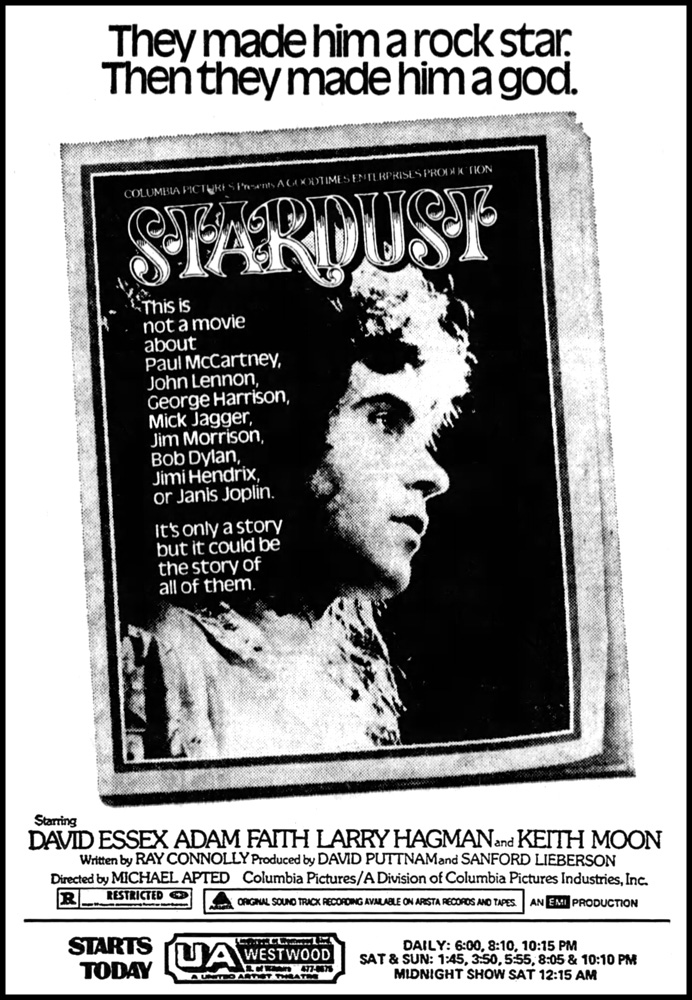 Over the years, we've been inundated with generic rock 'n' roll dramas, but this rarely-screened UK import is a standout, steeped in authenticity, attitude and unflinching turns. It's been 20 years since I'd last seen this downbeat film, and while its companion pic, director Claude Whatham's THAT'LL BE THE DAY, has been long available, this ambitious sequel remains MIA -- undoubtedly due to problems with the music rights, since its soundtrack overflows with classic tunes. THAT'LL BE THE DAY was a gritty li'l tale of early-'60s rebel Jim MacLaine (popstar David "Rock On" Essex), but scripter Ray Connolly and director Michael Apted (in his sophomore feature) have a more expansive agenda, as they follow the rise, phenomenal success, destruction, and self delusions of a British rock band (which often mirrors The Beatles' career trajectory). MacLaine's story picks up on the night of JFK's death, as Jim and his leather-jacketed quintet, The Stray Cats -- including Paul Nicholas, Dave Edmunds (who did double duty as the music supervisor) and drummer Keith Moon -- recruit longtime-bud Mike ('50s singer-turned-actor Adam Faith) as their manager and convince a local laundromat owner to be their Brian Epstein clone. They soon go from playing cavernous nightclubs and shagging local lovelies, to wearing mod suits and watching their first single top the charts. But tensions grow when Jim becomes the band's breakout star, and only increase when (never subtle) Larry Hagman appears as a wealthy scumbag who helps seduce MacLaine to the dark side of showbiz. Their exuberant rise to the top is nothing in comparison to the eventual band blowout, as deluded Jim gets a scary perm, sports silver-lame jackets and refers to himself as "the minstrel of a generation." Jim's longtime girlfriend (Ines Des Longchamps) is the only intelligent voice, but she eventually gets dicked around by Jim too. There's also his pretentious (and really painful) rock opera about the "deification of women," which looks like Rick Wakeman on Xanax. His spiral down is unapologetically heavyhanded, as Jim eventually turns into a reclusive, constantly-stoned basketcase hiding out in his private castle... We get the picture. Fame sucks. Showbiz can turn you into a dickhead. The paparazzi are parasites. Fans are pawns. And those damned musicians are even worse. The edgy script doesn't shy away from drugs, sex, corporate scum, and celeb-stupidity, while Apted and cinematographer Tony Richmond (DON'T LOOK NOW, THE MAN WHO FELL TO EARTH) expertly capture the grungy early locales, rise-to-fame hysteria, and how unchecked egotism can spoil the best party. Essex flounders during his heavier moments but has plenty of charm (and his resemblance to a 3rd-rate McCartney doesn't hurt matters), Moon brings some Who-esque lunacy to his small role (which primarily consists of throwing food), and the standout perf is from Faith, who rounds up the groupies, handles the payola and plays the all-around puppetmaster. It's an absorbing and incredibly cynical portrait of the highs and lows of music stardom.