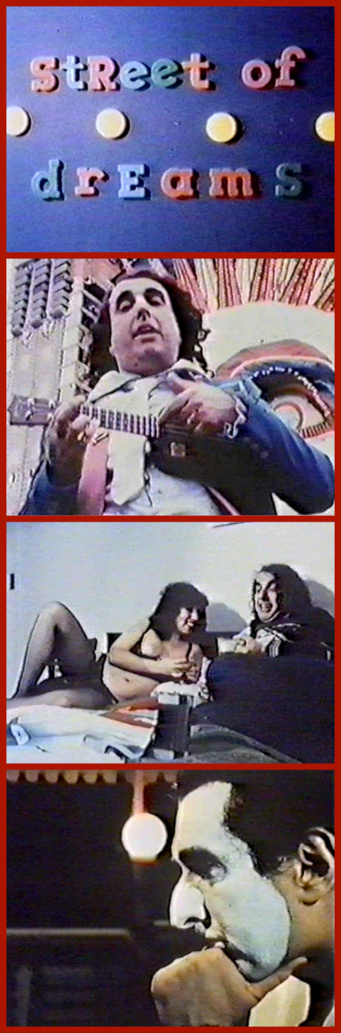 Never released on this side of the globe, this Australian, self-titled "musical mirror maze" is one of the more jaw-dropping oddities I've had the pleasure to witness. A feature-length, free-form documentary on singer/pop-icon Tiny Tim, it's an imaginative, altogether joyous portrait of the man who brought "Tip-Toe Thru the Tulips With Me" to the public forefront (and gave me a chance to stay up past my bedtime when he married Miss Vicki on THE TONIGHT SHOW in 1969). Ten years in the making, this cobbles together a fantastic array of footage, much of it revolving around the Sydney amusement area, Luna Park, circa 1978, where Tiny (long past the height of his popularity) tried to set the Professional, Non-Stop Singing Record. Following the film's fragmented route, we watch him tooling around Australia before this marathon song-fest; dressed as a king-size Mickey Mouse; Tiny (and his film crew) lost in a Hall of Mirrors; a seemingly-pissed Tim popping an oil can of fosters, with a topless flat-chested chick on his bed; and even pays a visit to Tiny's ancient mother, who shows off childhood photos. The only tiring moments have Tiny discussing his devotion to Christ and the Bible. Ahh, but that's only the tip of the weirdness, my friends. Back at Luna Park, Tiny (lugging his brown-paper-shopping-bagged ukulele) launchs into a medley of classic tunes ("Pennies From Heaven", "Don't Fence Me In", and even "Stayin' Alive"), which are all given his uniquely-vibrato treatment. In the process, director Martin Sharp (an Aussie artist, who also worked to restore Luna Park) expertly integrates these on-stage songs, with insights into Tiny's past (some of them none too flattering). We get footage from his wedding to Miss Vicki, and while most 45-year-old men would relish a chance to schtupp a teen-bride, Tiny admits that their bliss didn't last due to his belief that birth control was a Satanic invention and that "S-E-X can not be used, except for the glory of God's name and creating life" -- which led to an extremely unsatisfied Vicki. Along the way, Sharp also unveils a more sobering agenda, as we get a history lesson of this beloved amusement park, highlighted by a tragic incident on the Ghost Train ride, which burst into flame and claimed seven lives. Questioning if Mob arson was to blame, this bummer of a sideline only leaves an undoubtedly personal, yet ill-conceived aftertaste... Clocking in at 108 minutes, STREET OF DREAMS is, first and foremost, a Tiny Tim overdose. Although newcomers might be perplexed, it's all so unique and inspired that I couldn't stop smiling, as it captures his humanity, hilarity, and belovedly twisted lifestyle. It's not difficult to imagine that Tiny Tim was an off-stage weirdo, but it's gratifying to see it chronicled for posterity, while realizing he actually exceeded expectations.