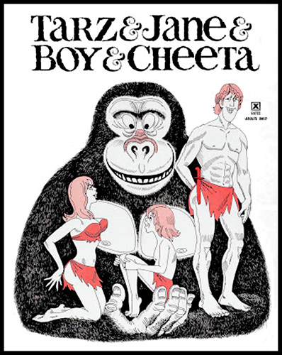 TARZUN was simply crude and filthy, but TARZ & JANE, CHEETA & BOY is a cornier concoction that mixes bishop-flogging sex scenes with ridiculous dialogue ("Shit, boy. Tarz tired of this jungle crap.") and physical comedy that makes Benny Hill look sophisticated (when Tarz uses an ear of "jungle corn" as a dildo, popcorn bursts from the gal's twat). Tarz ("Elmo Brix" a.k.a. Patrick Wright) sports a wig swiped from a drag queen, Jane ("Silver Fox" a.k.a. Tally Wright) stumbles about in three-inch heels, and their "Boy" is pushing 30, but has the sexual knowledge of a 5-year-old Mormon. When a crocodile bites off Tarz's "dork," the Jungle King is depressed, Jane looks to Boy for sexual relief, and they all journey to dangerous Wango Wango country in search of a huge new penis. "Cheetah" (a guy in a baggy ape suit) follows 'em on this trek, making rude gestures. The only actor who shows any enthusiasm with this gig is ever-reliable Georgina Spelvin as Wanda, a white chick on safari, who has stolen the Wango Wango's treasure with the aid of her fruity assistant. Although there's lots of nudity, whenever anything gets too racy, the hardcore bits suddenly switch to solarized footage, and at 72 minutes, there are far too many tedious stretches. Few of the participants wanted to take credit for this crap (the director is listed as "Itza Fine"), but at least the financiers had enough dough to build a makeshift tree house and a rubber crocodile with flapping jaws, in addition to renting an old sedated tiger for Tarz to wrestle.