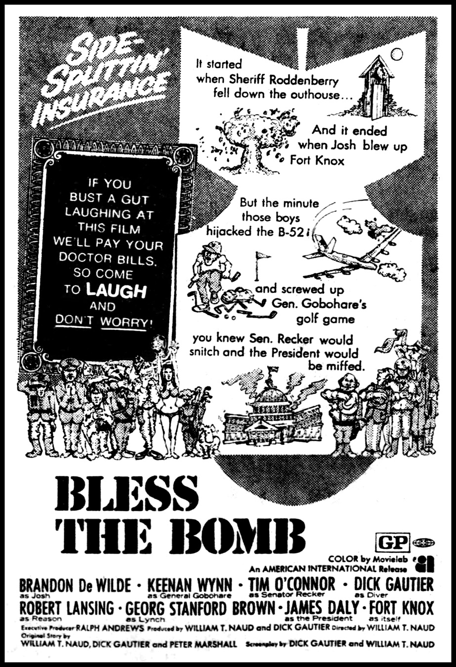 This obscure American International Pictures release was shot as GOD BLESS YOU, UNCLE SAM in late-1969, but didn't hit theatres until nearly three years later, under various titles and with ridiculously disparate ad campaigns. WILD IN THE SKY sold the film as a groovy action-thriller, BLESS THE BOMB appeared to be a "far out" farce and BLACK JACK -- capitalizing on 6th-billed Georg Stanford Brown's success on TV's THE ROOKIES -- looked like typical blaxploitation (with AIP double-billing the film with BLACK CAESAR for its New York City run). So what exactly is this thing? An awkward blend of limp counterculture trappings, underbaked comic ideas and floundering character actors, which fails on almost every level... Draft-dodgers Josh (Brandon De Wilde, best known as the whiny li'l kid in SHANE), Woody (Phil Vandervort) and Lynch (Brown) are being driven to prison when their good-ol'-boy police escort (Dub Taylor) makes a piss-stop, gets knocked into an outhouse's shithole and the trio escapes. Not the brightest fugitives, the threesome avoids capture by sneaking onto an Air Force base in the middle of the night and hiding inside a B-52 bomber equipped with a Hydrogen Bomb. Once in the air, our stowaways take the crew hostage and arm this nuke, but don't have any concrete plan about what to do next. Meanwhile, Keenan Wynn's bombastic general (who has misappropriated millions of dollars for his own personal golf course) attempts to cover up this snafu. DR. STRANGELOVE, it ain't... Sluggishly directed by William T. Naud (whose only previous features were the '60s auto-racing cheapies HOT ROD HULLABALOO and THUNDER IN DIXIE), its convoluted script -- credited to Dick Gautier (GET SMART robot Hymie) and Naud, with HOLLYWOOD SQUARES host Peter Marshall receiving a story credit -- is peppered with broad slapstick, clumsy misunderstandings and leaden satire. On the upside, it includes plenty of familiar faces as supporting government and military officials, most of whom are either blithely self-serving or thoroughly incompetent. There's Larry Hovis (HOGAN'S HEROES) and Jack Riley (THE BOB NEWHART SHOW); Robert Lansing is a major onboard this hijacked flight; Tim O'Connor is a pissed-off senator; James Daly (father of Tyne Daly and then-current father-in-law of Stanford Brown) plays a macho, bullshit-spewing US President who tries to negotiate with these "adolescent twerps"; while the only intermittent chuckles originate from the B-52's eccentric flight crew, consisting of Gautier, future LOVE BOAT physician Bernie Kopell and Joe Turkel (THE SHINING, BLADE RUNNER) in a refreshingly comedic change of pace. On the other hand, Stanford Brown plays all of this pseudo-absurd nonsense totally serious, but his one-note 'angry black dude' is still far less grating than his conflicted peacenik cohorts. Unfortunately, top-billed, 30-year-old De Wilde (who died in a Denver camper van accident a few months after this chaotic mess was finally released) is utterly forgettable in his final screen appearance.